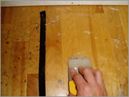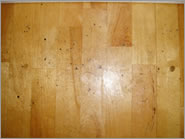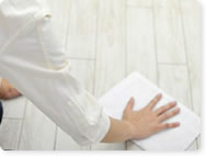 社交ダンス用の床は、薬品で洗浄する事が出来ません。そこで、当社は床を傷めない為にこのように手作業で汚れを取り除きます。
